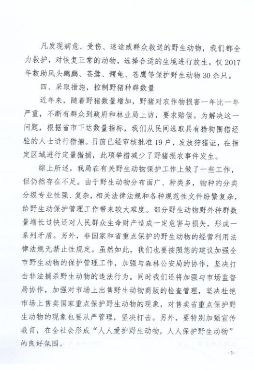 对"关于加强野生动物保护,打击非法捕杀和非法销售野生动物的建设"的答复